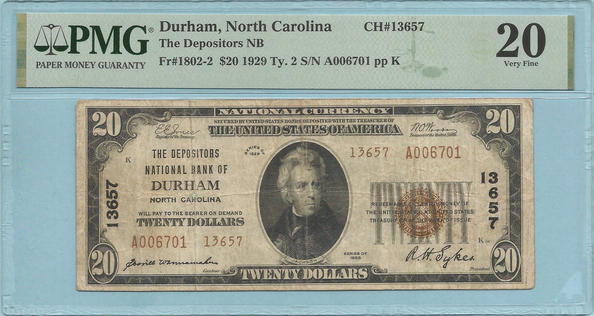 $20 National Currency 1929-T2 - Ch#13657 - Depositors NB, Durham, NC - PMG 20