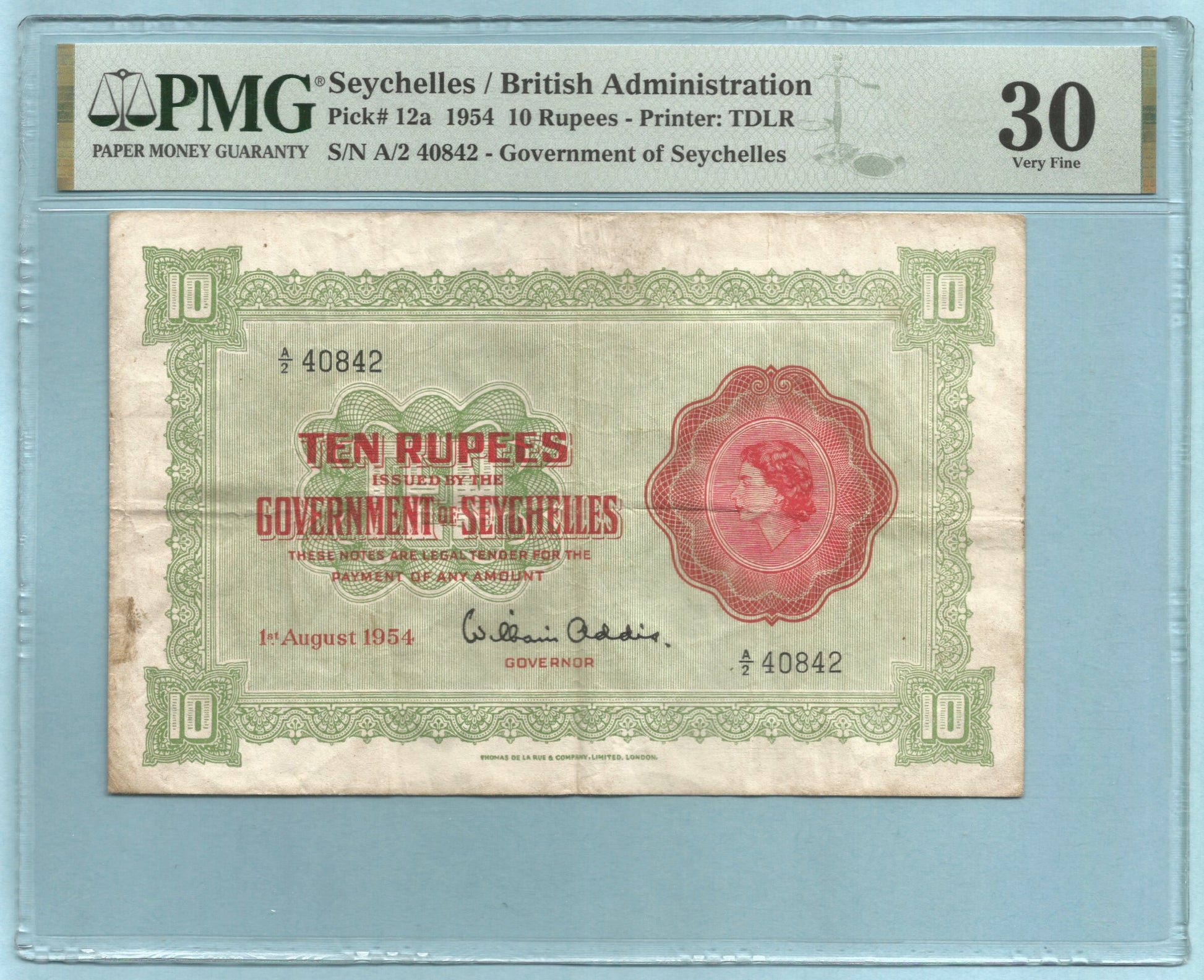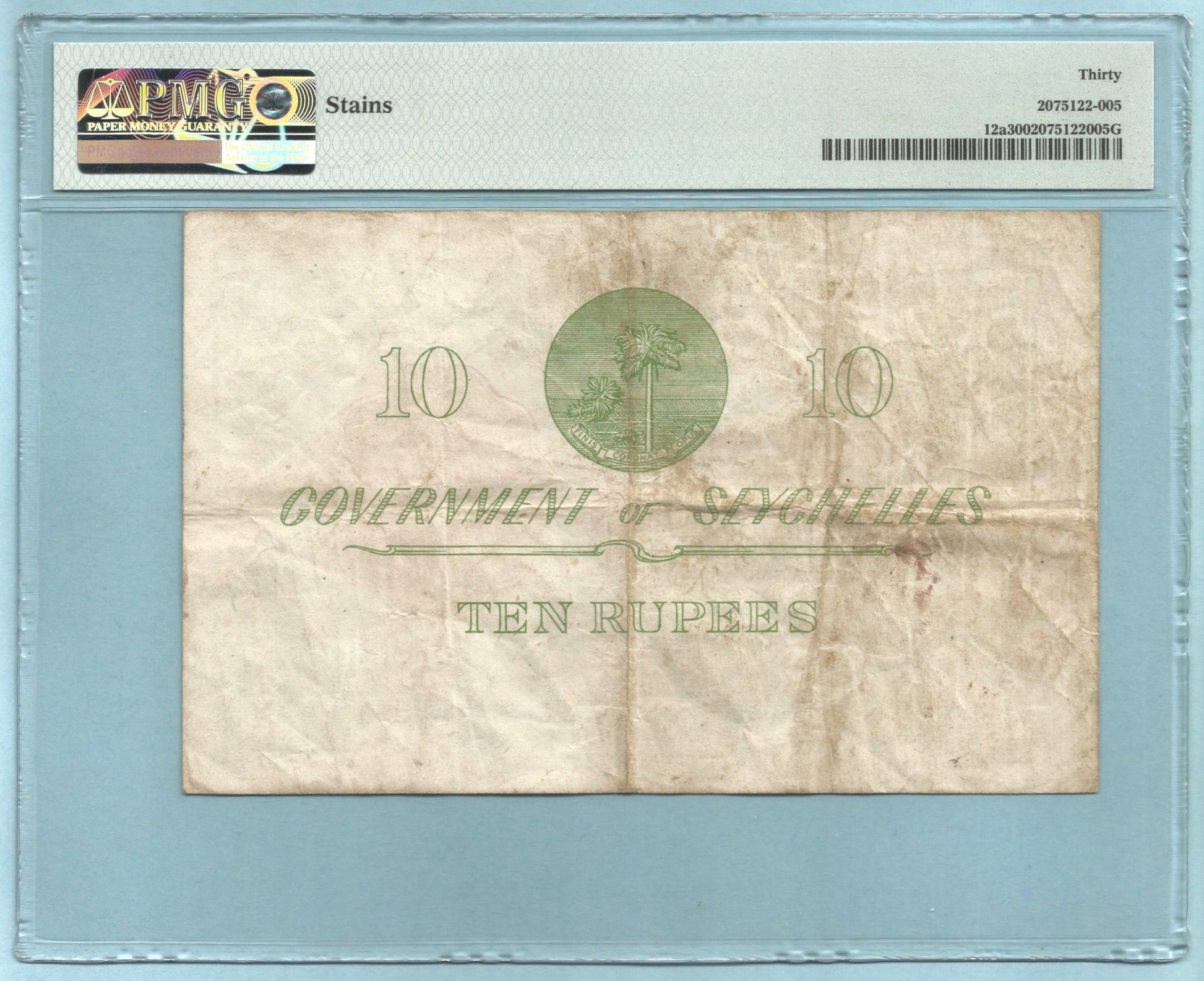 Seychelles 10 Rupees 1.8.1954 P#12a Banknote PMG 30 - Stains