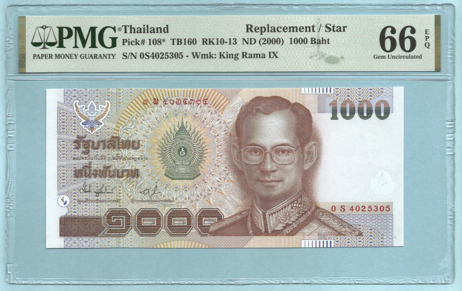 Thailand 1000 Baht - ND(2000) P#108* - REPLACEMENT NOTE - Prefix 0S - PMG 66 EPQ