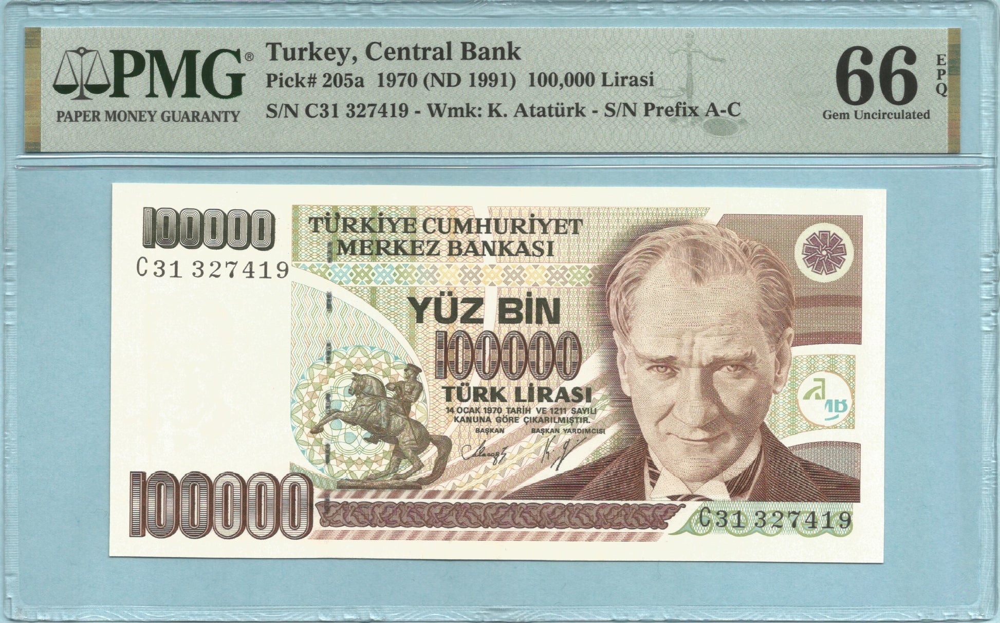 Turkey 100,000 Lira - L.1970(1991) - P#205a - PMG 66 EPQ