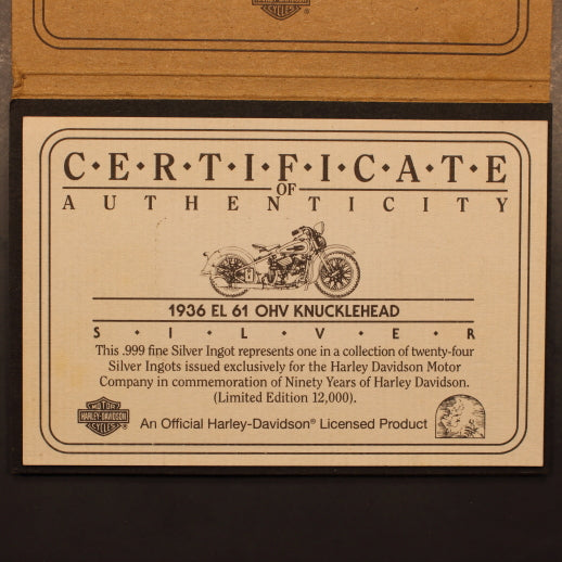 USA Harley-Davidson 1936 Knucklehead - 43g Pure Silver Ingot w/ Orig Card & Cert